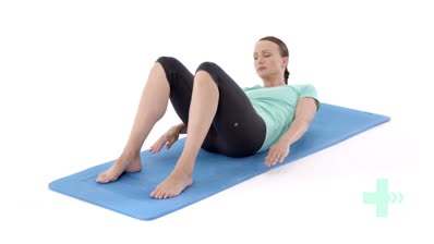With your arms by your sides, tighten your abdominal muscles and curl your upper back up off the floor.