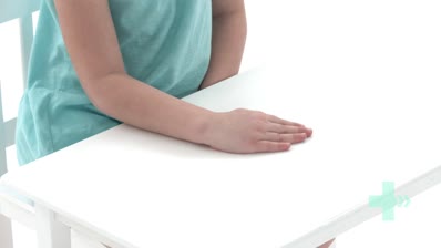 Sit upright in a chair with your forearm resting on a table, palm facing down.