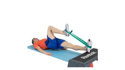 Lie on your back with your heels on a step. An exercise band loop around your forefeet.